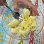 1- قومي بتقطيع ثمرة الموز إلى قطع صغيرة ثم ضعيه في إناء واهرسيه باستخدام ملعقة معدنية