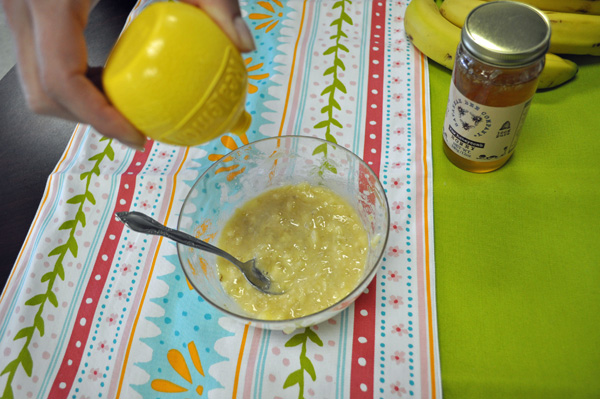 2- قومي بإضافة ملعقة العسل إلى الموز وكذلك قومي بإضافة عصير الليمون إليه واخلطيهم معا جيدا جدا