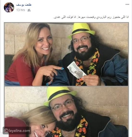 التي ربطت بين الفنانة ريم البارودي وابن طلعت زكريا، دفعت الأخير لاطلاق مزحة على حسابه على الفيس بوك، معلناً زواجه من ريم وأنه دفع لها مهراً 100 جنيه.ما نشره طلعت زكريا من مزحة تخص زواجه من ريم البارودي لم يدركها بعض متابعيه بعد، الذين أخذوا يكتبون التهاني لهما، بينما تساءل أخرون عن كيفية ارتباطهما عاطفياً!